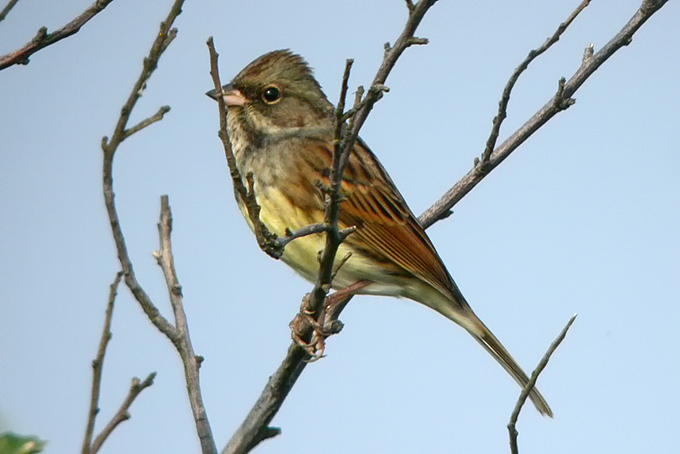 Clear, though with visibility down to ca 30 Km, and fair movement out NW in the early morning. In one sample hour (0800-0900), most numerous were Chestnut Bunting (83) and Olive-backed Pipit (76), with lesser numbers of Black-faced, Yellow-breasted, Chestnut-eared and Meadow Bunting also mixed in. In addition, at least 22 Yellow-browed Warbler were counted flying out to sea (with another 50 in trees nearby), along with probably 4 different Zitting Cisticola.