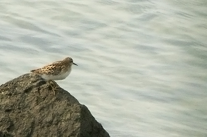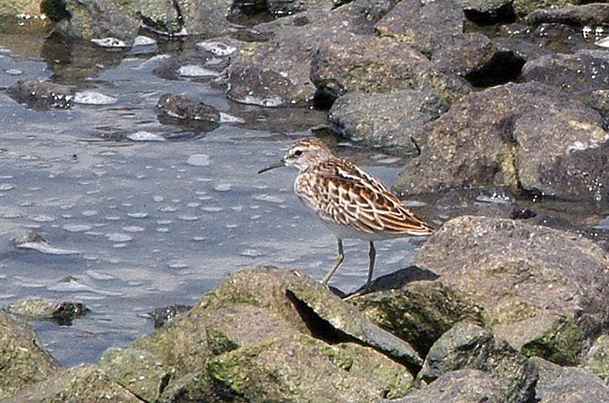 The brackish strip of water left from the ongoing reclamation held 18 more Spoonbills, 1 Chinese Egret, a Moorhen, 30 Common Greenshank, 250 Black-tailed Godwits, 1 Common and 1 Spotted Redshank, 18 Marsh Sandpipers, 1 Long-toed Stint, and most unexpected, an apparent Pectoral Sandpiper (a species I'm very familiar with) which made a brief appearance, coming out of the reeds onto a mudbank then walking back out of view (probably to roost on a hidden bank). The bird showed the upright, heavy-bodied, small headed profile of the species, characteristic behavior (e.g. walk) as well as the distinctive, abrupt lower "pectoral" dermarcation; judging by supercilium (somewhat weak but most evident behind eye) this was probably a juvenile (plumage, though, was not particularly bright, i.e. a fairly dull brown, lacking rufous or frosted highlights; legs looked a dull greenish-yellow). The bird did not reappear during the time I had left.