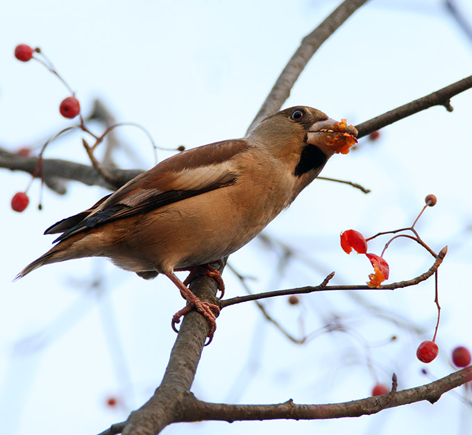 A short visit to the campus of Samyook University: winter regulars all around: Eurasian Nuthatch, Goldcrest, Greater Spotted and Japanese Pygmy Woodpeckers, a Dusky Thrush (heard), a distant Siskin flock flying, a close Common Buzzard flying, a loud cock Pheasant flying, Varied, Great, Marsh and Long-tailed Tits, and a good dozen Hawfinches feasting on berries.