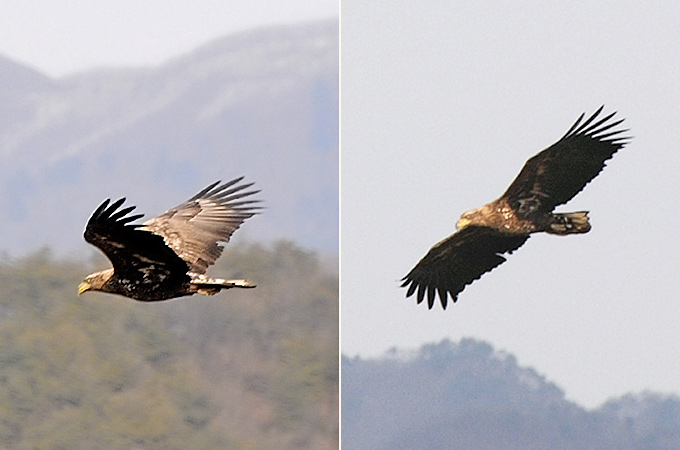 Sunday 8 March I had a look along the river and down to the new dam area northwest of town where the water level is now very low. Most common were Spot-billed Ducks, Mallards, Common Mergansers and Grey Herons. Many of the herons are now showing breeding colours. I also saw some Common Teal, 2 Eurasian Wigeons and 2 Gadwalls. Over the dam area I found 4 White-tailed Sea Eagles, 2 adults and 2 juveniles. The eagles caused quite a stir with the Grey Herons, the latter all taking flight when one of the eagles flew overhead.