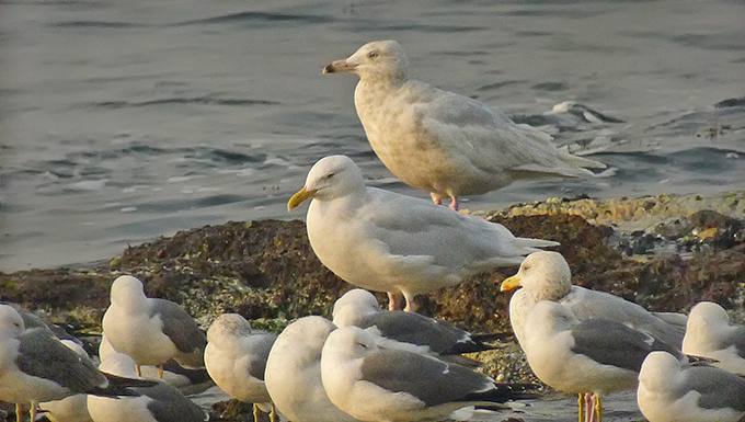 Although we searched high and low, we were unable to find any Iceland. But we found 15 Glaucous Gulls. Almost all were pallidissimus, save one gull, fitting many of the criteria found in a barrovianus; smaller sized than pallidissimus, a shorter smaller bill, broad dark tip, short primary projection, dark markings still visible on the breast, yet having very pale eyes. An image is posted below.