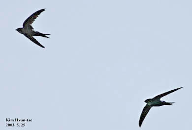 This is especially surprising considering both the increased reporting of extralimital species such as Himalayan Swiftlet Collocalia brevirostris and House Swift Apus affinis in South Korea, and also the proven vagrancy of the region's Pacific Swift Apus pacificus on several occasions to Europe! The lack of confirmed records, however, belies its likely status here. There have already been several recent observations of suspected Common Swift in South Korea - mostly in late autumn along the south coast, with for example the first noted on Gageo Island on October 1st, 2001 (NM); a second in Busan on November 12th, 2002 (NM); and 3 together also on Gageo Island, on October 7th, 2003 (Mathias Ritschard et al, in lit.). They were identified as putative Common Swift simply on the basis of appearing all-dark above during prolonged views, but as they were all viewed at moderate distance, separation from the obvious confusion species Pacific Swift (otherwise known, rather confusingly as Northern White-rumped or Fork-tailed Swift) could not be confirmed - not to the level necessary for claiming a national first record.