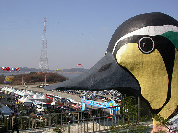 - November 18th-22nd: With support funding provided to Birds Korea from the Korea Wetlands Project, a series of meetings conducted jointly with Birds Korea and Mr. Ken Gosbell, Chair of the Australasian Wader Studies Group, to help distribute the SSMP report. Meetings included with Professor Joo Gea-Jae of Busan National University and with the Nakdong Estuary Conservation Group (on 19th); with officials from the Ministry of Maritime Affairs and Fisheries and the Ministry of Environment (on 20th); with the Mayor of Gunsan and other officials, followed by a seminar, co-organised with Saemangeum Alliance for Peace and Environment (??) attended by more than 30 people at the Jeollabuk Provincial Government building (on 21st);  Mr. Ken Gosbell, Chair of the Australasian Wader Studies Group, with Ms. Park Meena (Birds Korea National Coordinator) and volunteer Ms. Kim Boram, at Miyeonji Tidal-flat, Nakdong Estuary, November 19th, 2007. Photo © Nial Moores Mr. Ken Gosbell, Chair of the Australasian Wader Studies Group, with Ms. Park Meena (Birds Korea National Coordinator) and volunteer Ms. Kim Boram, at Miyeonji Tidal-flat, Nakdong Estuary, November 19th, 2007. Photo © Nial Moores Overview of the Gunsan World Migratory Bird Festival, November 21, 2007, held next to the Geum River Important Bird Area. Although the opening day of this year's festival was dominated by a huge building-sized model of a Baikal Teal, overflown by motorised hang-gliders, the Mayor of Gunsan stated very positively and encouragingly that in future years the festival will instead emphasise training and environmental education. Photo © Nial Moores Overview of the Gunsan World Migratory Bird Festival, November 21, 2007, held next to the Geum River Important Bird Area. Although the opening day of this year's festival was dominated by a huge building-sized model of a Baikal Teal, overflown by motorised hang-gliders, the Mayor of Gunsan stated very positively and encouragingly that in future years the festival will instead emphasise training and environmental education. Photo © Nial Moores