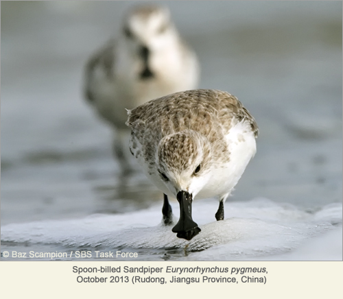 | (1) | The international Spoon-billed Sandpiper Task Force is set up under the East Asian-Australasian Flyway Partnership to implement conservation measures to reverse the declines in the Critically Endangered Spoon-billed Sandpiper, a small sandpiper with a uniquely shaped bill that nests in the Russian Arctic, and migrates through Eastern Asia to winter in Southern and SE Asia http://www.eaaflyway.net/spoon-billed-sandpiper.php Experts in the survey team came from the Republic of Korea, Russia, Japan, Myanmar, the UK and the US. |