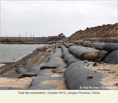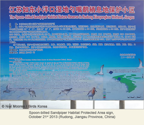 Many of the most important intertidal wetlands along the Jiangsu coast are still threatened by continuing reclamation for agricultural and industrial development. However, local and provincial authorities now recognise the international importance of the area and this month designated a protected area in Rudong for Spoon-billed Sandpiper, along with additional areas to conserve shellfish stocks.
