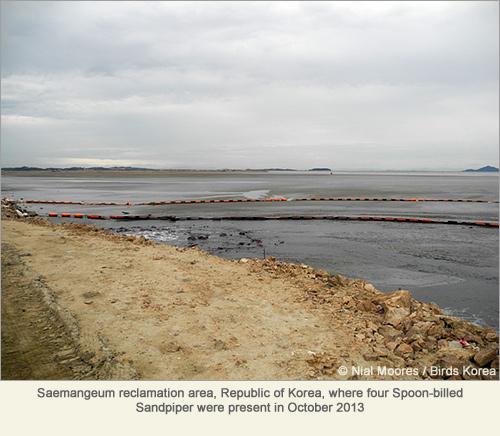 | (6) | Between August-October 2013, Spoon-billed Sandpipers were recorded in the ROK at: Song Do, Incheon (1); Geum Estuary (12- 15); within Saemangeum reclamation area (4); and at the Nakdong Estuary (3). |