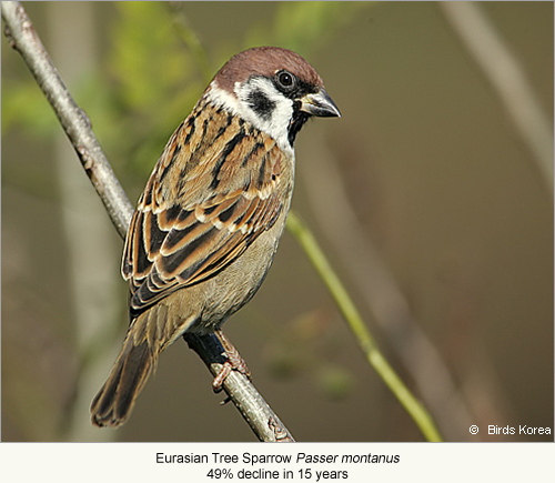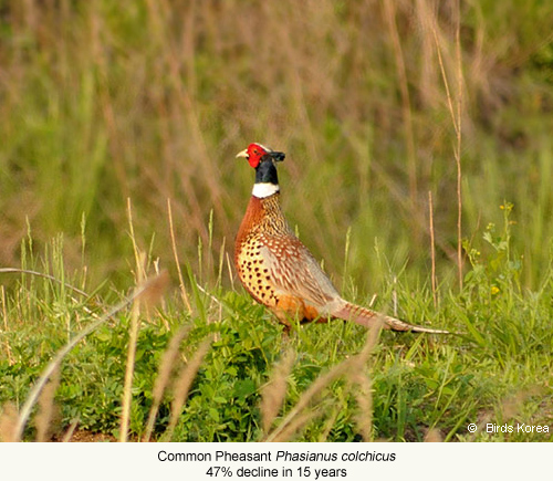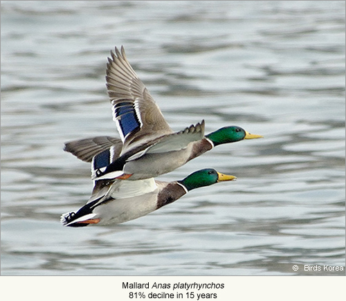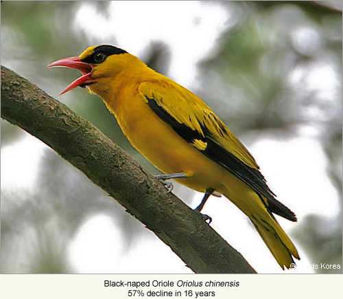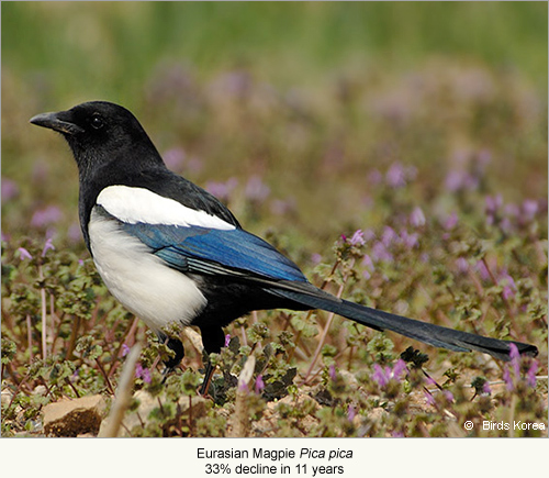 Regrettably, the evidence from the ROK is clear: biodiversity, including avian biodiversity, is in decline. An analysis of historical bird status in the ROK between 1910 and 2009 reveals that more than a third of regularly-occurring bird species declined substantially during the past century, including at least 24 out of the 50 species of global conservation concern regularly recorded here. Only three out of these 50 globally Threatened or Near Threatened bird species showed any evidence of increase during the same period (Moores 2011). Of greater concern, rates of decline appear to be increasing. A report published by the National Institute of Biological Resources (NIBR 2011) includes count data on 20 widespread bird species from 406 randomly-selected study areas. Some of these species have been counted regularly since the mid-1990s and others since the early-2000s. Our analysis of these data shows that 15 out of 20 widespread bird species are at present declining rapidly and only three species have increased. The largest declines have been in several species of duck (including an 81% decline in Mallard Anas platyrhynchos over 15 years), but have also included declines of 57% in Black-naped Oriole Oriolus chinensis over 16 years; 49% in Tree Sparrow Passer montanus and 47% in Common Pheasant Phasianus colchicus over 15 years; and 33% in Eurasian Magpie Pica pica and 27% in Barn Swallow Hirundo rustica over only 11 years. Thus, several of the most numerous and well-known bird species found in agricultural land, wetlands and forests are now in rapid decline. Based on other published and unpublished data, many scarce and more easily-disturbed species are also in rapid decline. It is therefore straightforward to conclude that development in these different habitats and at the national level is unsustainable.